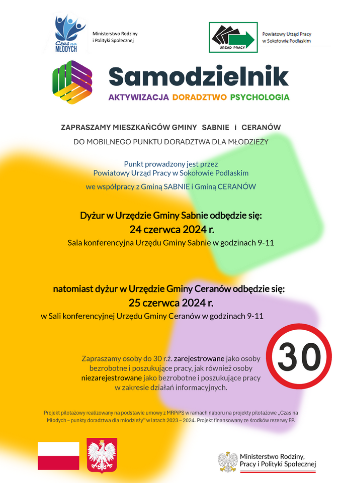 Zapraszamy mieszkańców Sabni i Ceranowa do Mobilnego Punktu doradztwa dla młodzieży. Będziemy w sali konferencyjnej Urzędu Gminy Sabnie 24 czerwca 2024 r. w godzinach 9:00 - 11:00, a w Ceranowie 25 czerwca 2024 r. w godzinach 9:00 - 11:00, sala konferencyjna Urzędu Gminy Ceranów.