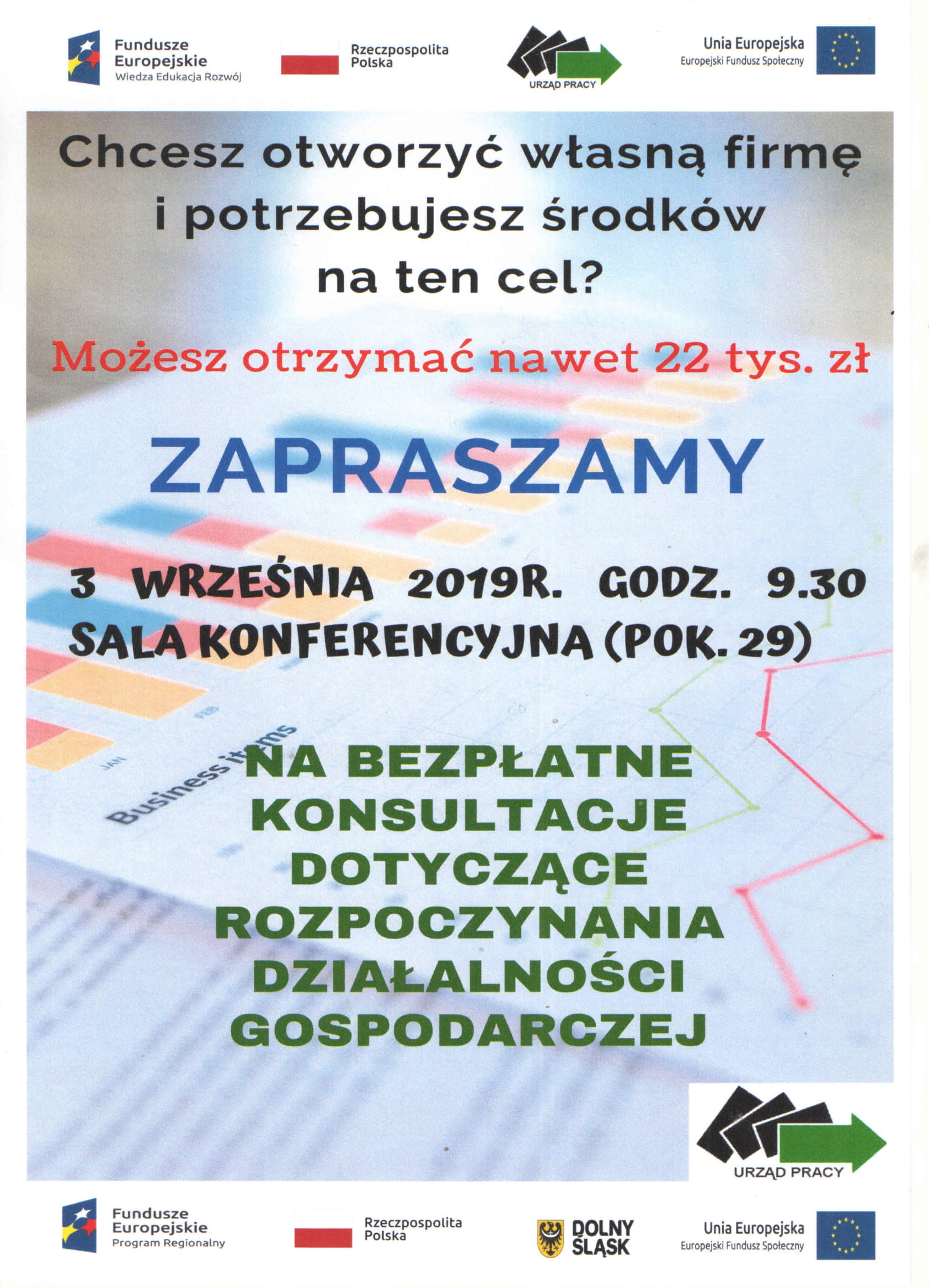 Powiatowy Urząd Pracy w Lwówku Śląskim zaprasza wszystkie osoby bezrobotne, zainteresowane otrzymaniem dotacji na rozpoczęcie własnej działalności gospodarczej w dniu 3 września 2019r. o godz. 9.30 do sali konferencyjnej (pok. 29) na bezpłatne konsultacje dotyczące rozpoczynania działalności gospodarczej.