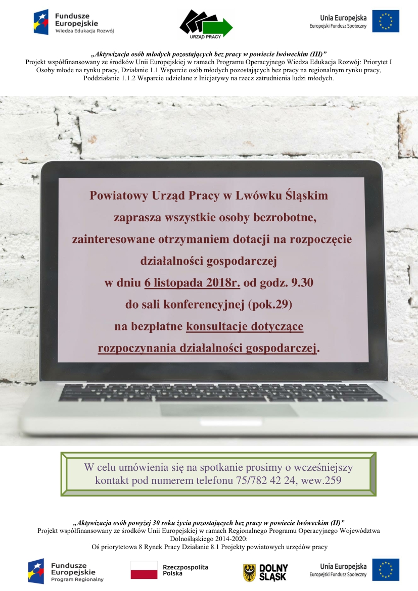 Powiatowy Urząd Pracy w Lwówku Śląskim zaprasza wszystkie osoby bezrobotne, zainteresowane otrzymaniem dotacji na rozpoczęcie działalności gospodarczej w dniu 6 listopada 2018r. o godz. 9.30 do sali konferencyjnej (pok.29) na bezpłatne konsultacje dotyczące rozpoczynania działalności gospodarczej.