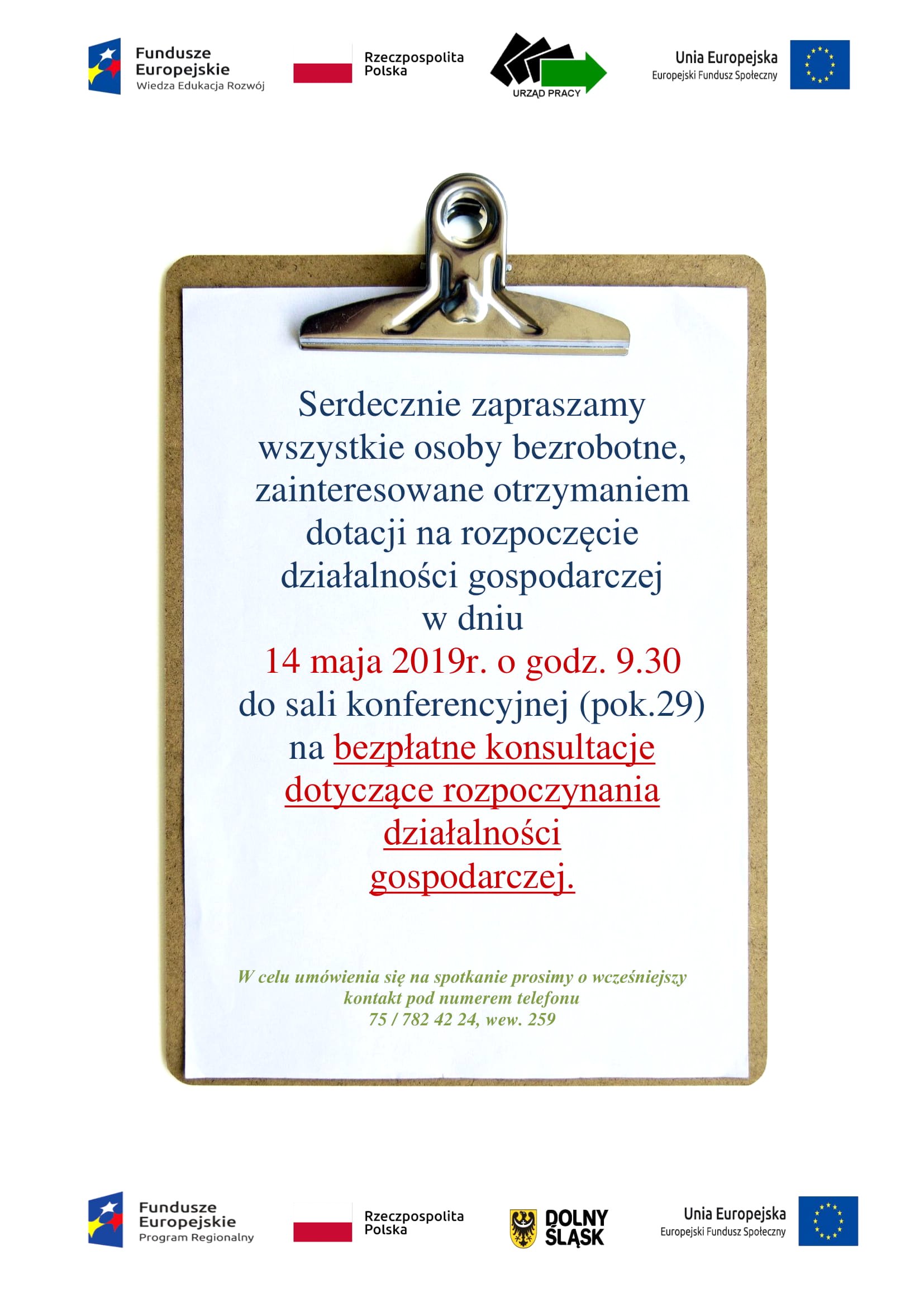 Powiatowy Urząd Pracy w Lwówku Śląskim zaprasza wszystkie osoby bezrobotne, zainteresowane otrzymaniem dotacji na rozpoczęcie działalności gospodarczej w dniu 14 maja 2019r. o godz. 9.30 do sali konferencyjnej (pok.29) na bezpłatne konsultacje dotyczące rozpoczynania działalności gospodarczej.