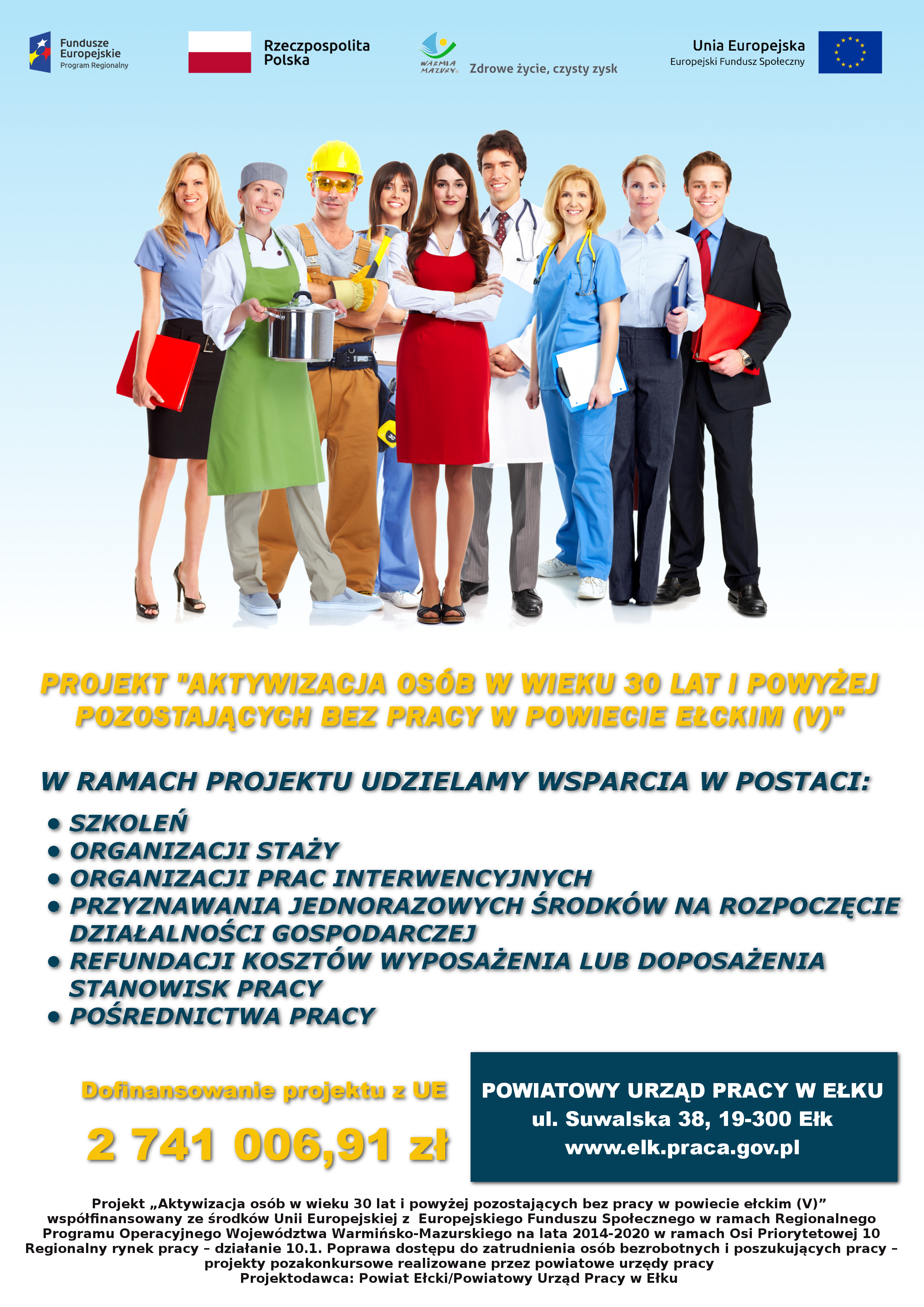 Celem głównym projektu jest zwiększenie zdolności do zatrudnienia osób od 30 roku życia pozostających bez pracy w powiecie ełckim.