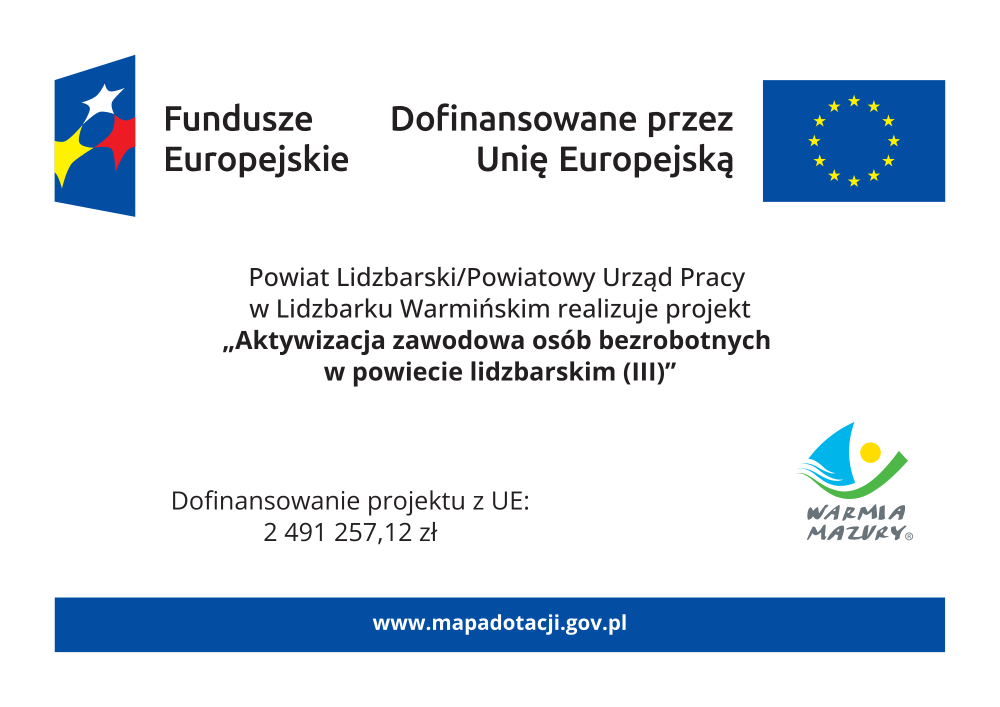 Powiatowy Urząd Pracy w Lidzbarku Warmińskim realizuje projekt pt. „Aktywizacja zawodowa osób bezrobotnych w powiecie lidzbarskim (III)" w ramach programu regionalnego Fundusze Europejskie dla Warmii i Mazur 2021-2027, współfinansowanego ze środków Europejskiego Funduszu Społecznego Plus (EFS+).