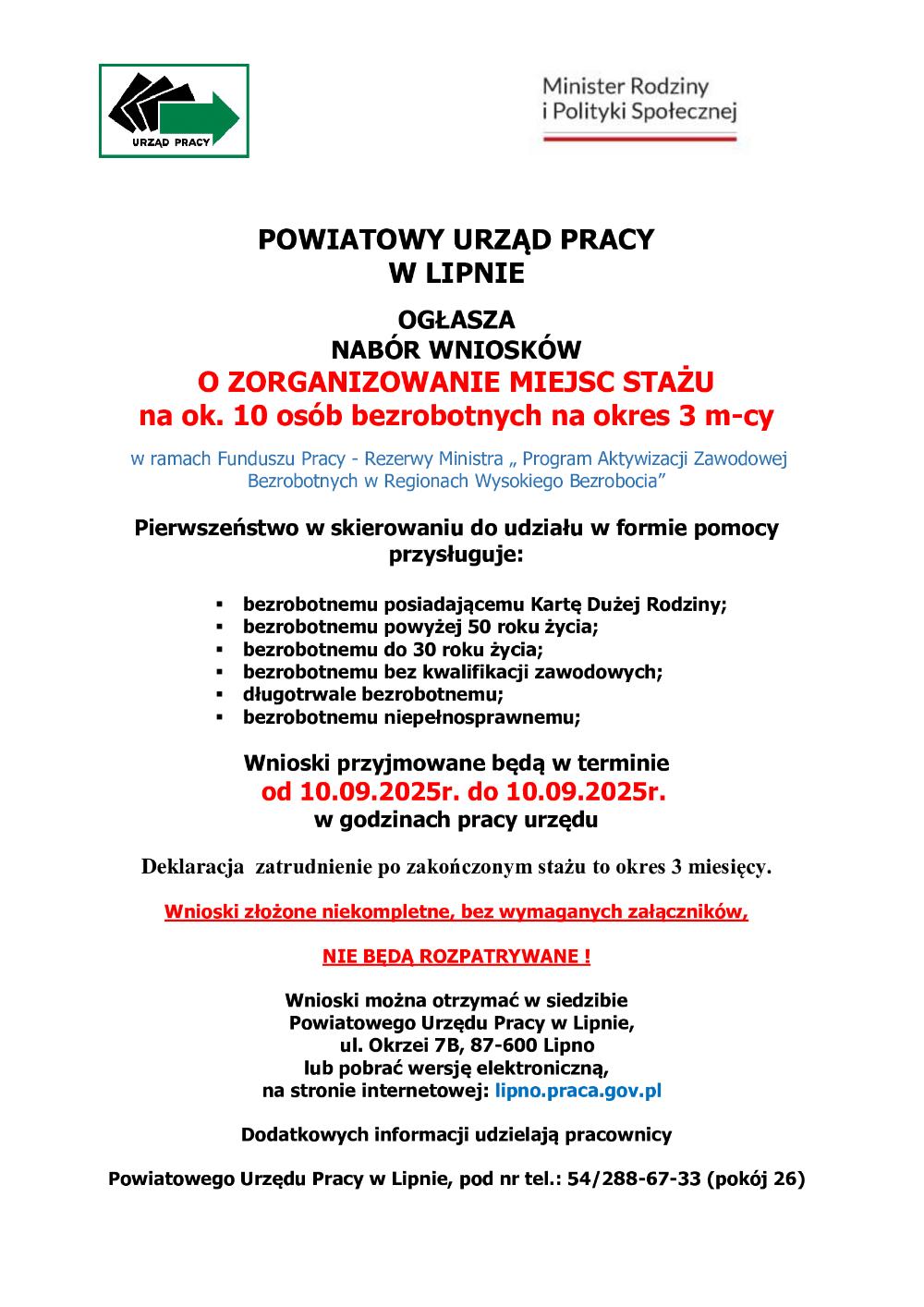 Ogłoszenie naboru na organizację staży w ramach środków Rezerwy Ministra. - Powiatowy Urząd Pracy w Lipnie
