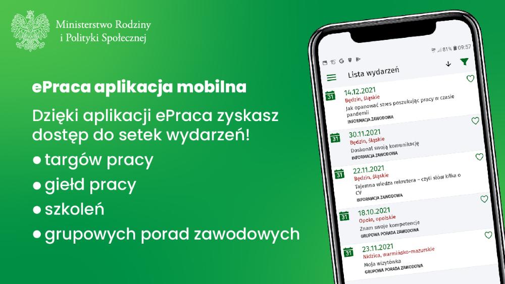 Powiatowy Urząd Pracy w Sępólnie Krajeńskim zachęca do korzystania z aplikacji ePraca, która służy do wyszukiwania i przeglądania ofert pracy oraz wydarzeń gromadzonych przez Ministerstwo Rodziny i Polityki Społecznej na portalu Centralnej Bazy Ofert Pracy https:// oferty.praca.gov.pl