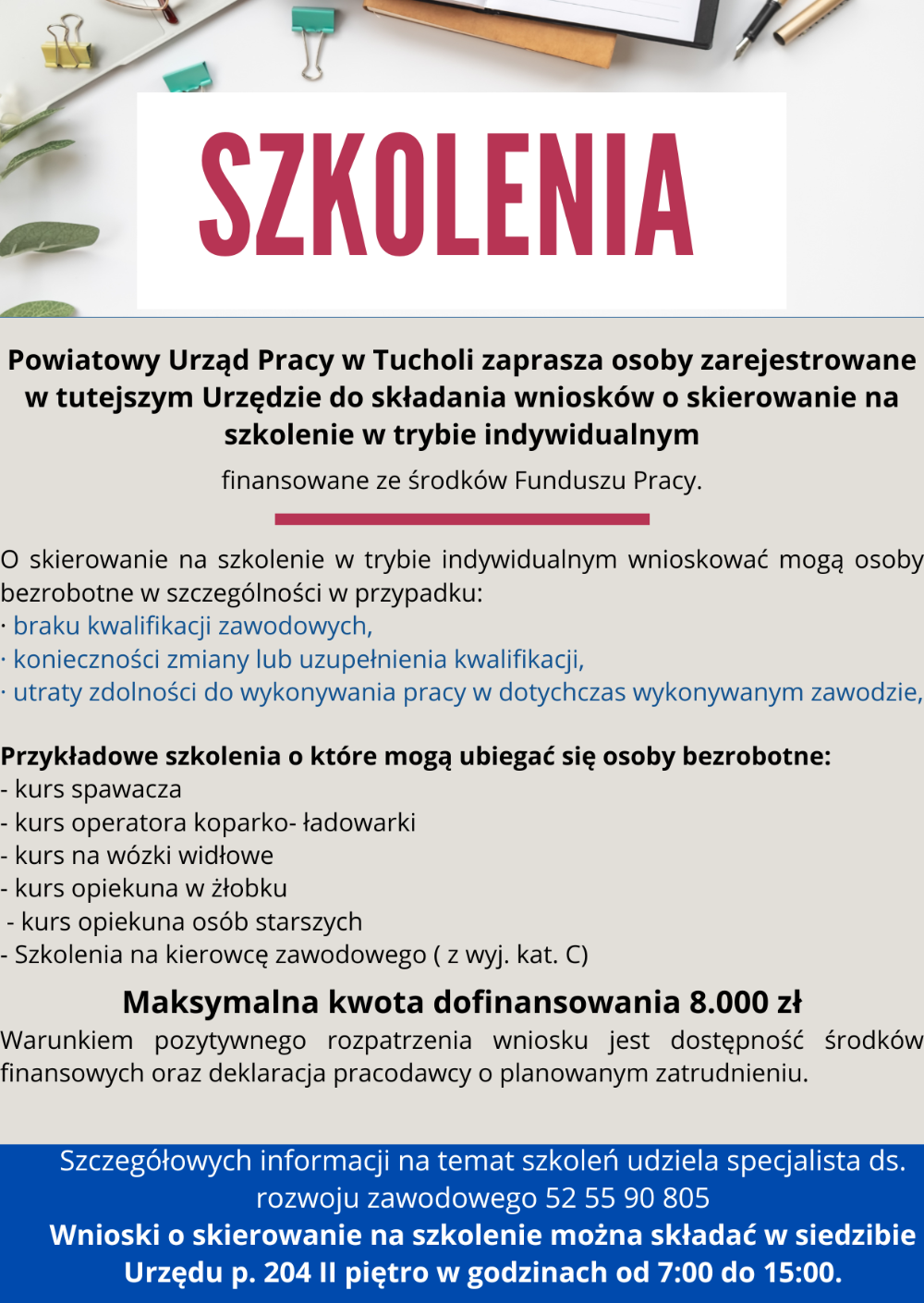 Powiatowy Urząd Pracy w Tucholi zaprasza osoby zarejestrowane w tutejszym Urzędzie do składania wniosków o skierowanie na szkolenie w trybie indywidualnym finansowane ze środków Funduszu Pracy.