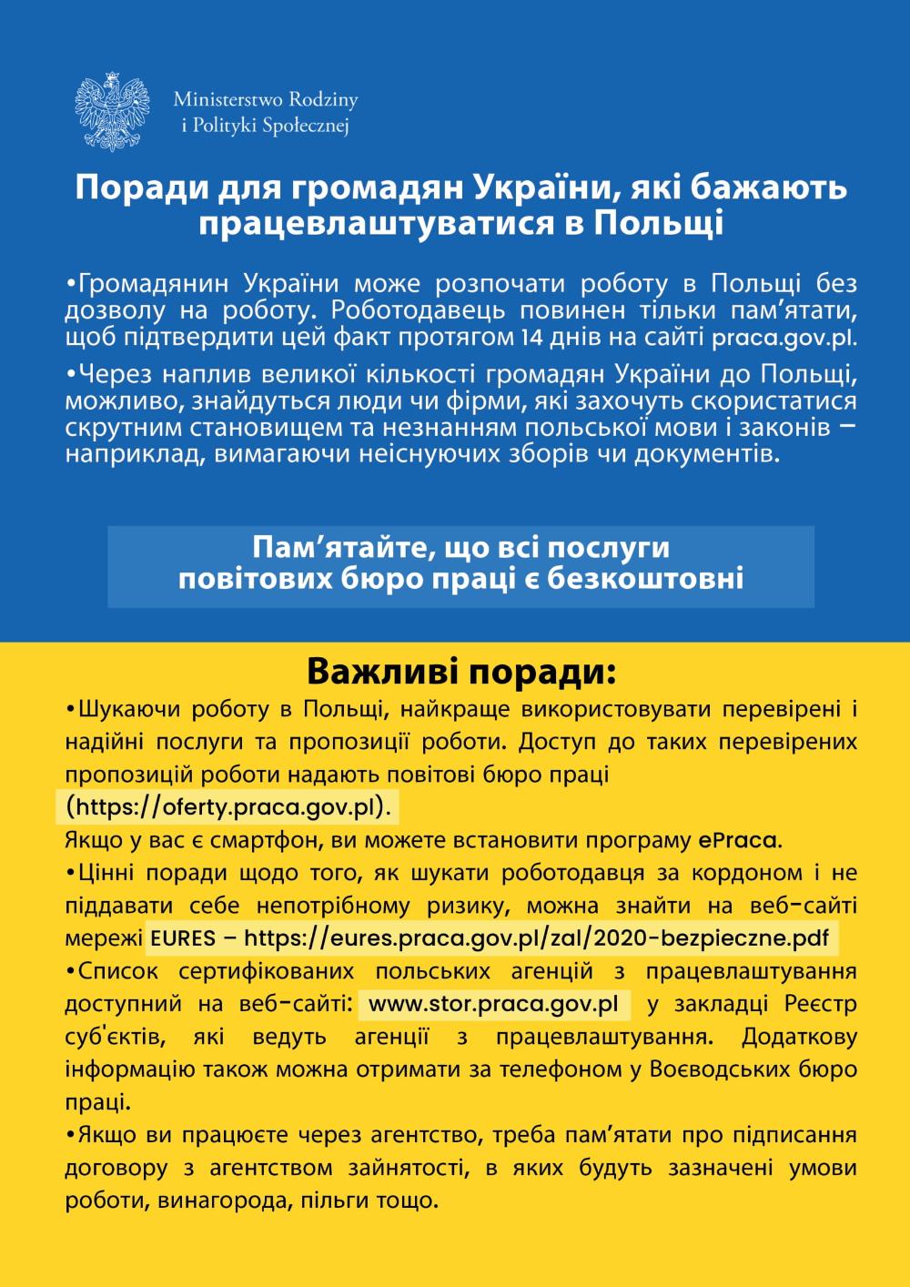 Rady dla Obywateli Ukrainy zainteresowanych podjeciem pracy w Polsce / Поради для громадян України, які бажають працевлаштуватися в Польщі