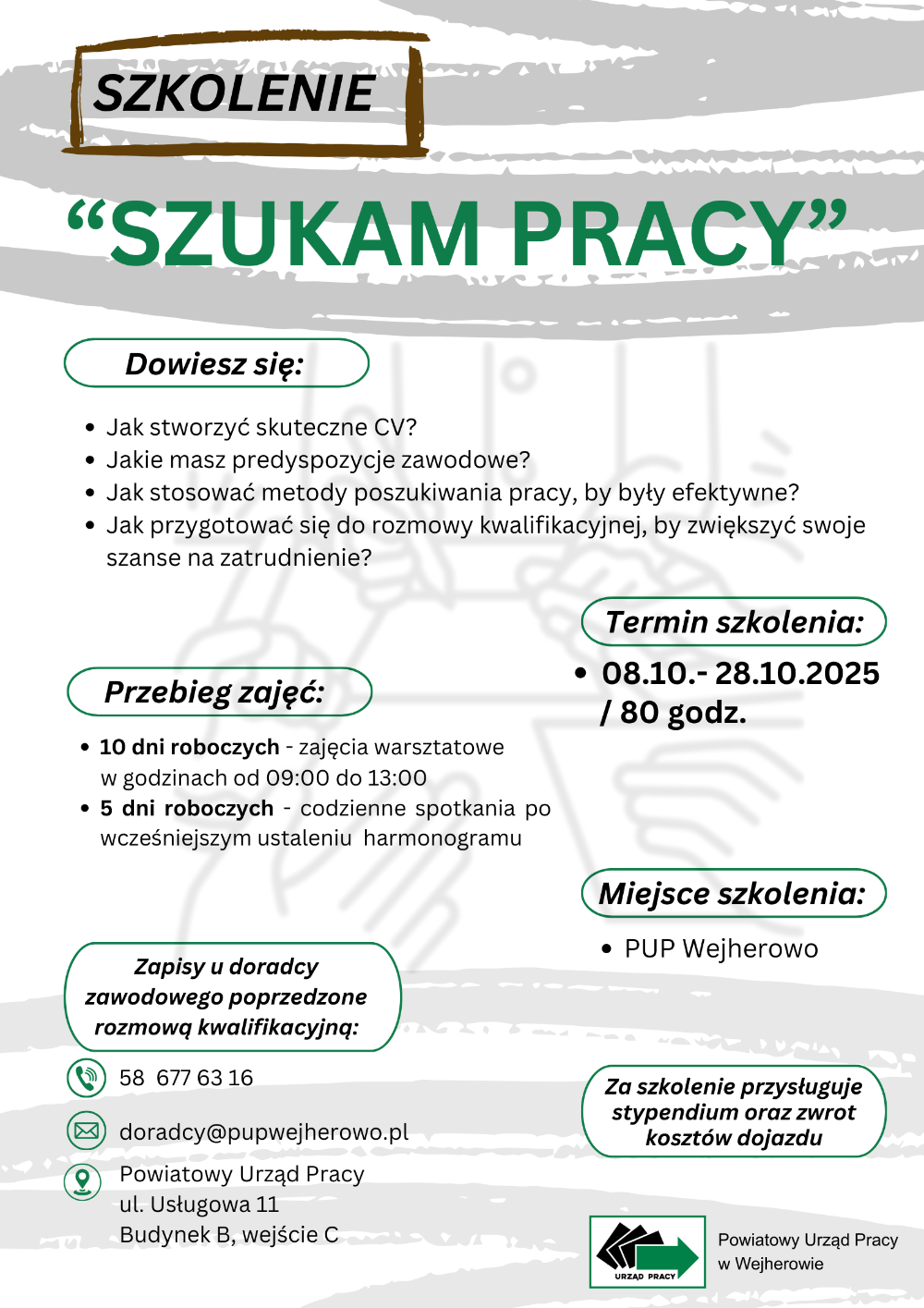 Powiatowy Urząd Pracy w Wejherowie informuje, iż w dniach 08.10.2025 – 28.10.2025 planowana jest realizacja szkolenia grupowego pn. „Szukam pracy” w wymiarze 80 godzin dydaktycznych.