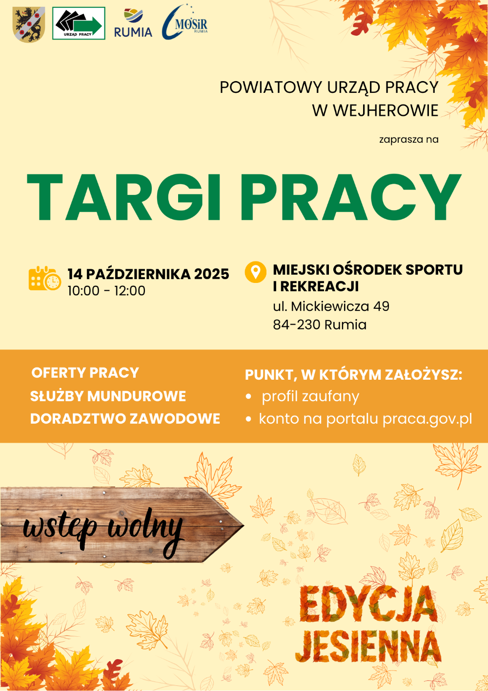 Powiatowy Urząd Pracy w Wejherowie serdecznie zaprasza wszystkich zainteresowanych do udziału w Targach Pracy – Edycja Jesienna, które odbędą się 14 października 2025 r. w Miejskim Ośrodku Sportu i Rekreacji w Rumi (ul. Mickiewicza 49).
