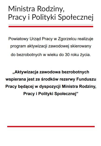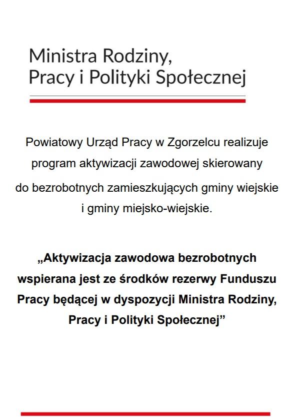 „Aktywizacja zawodowa bezrobotnych wspierana jest ze środków rezerwy Funduszu Pracy będącej w dyspozycji Ministry Rodziny, Pracy i Polityki Społecznej” 2025 - Powiatowy Urząd Pracy w Zgorzelcu