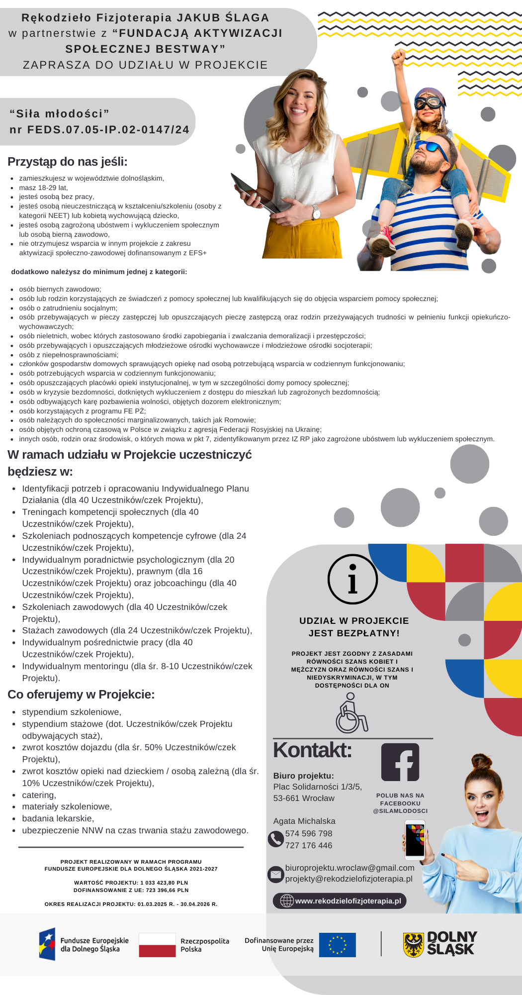 Rękodzieło Fizjoterapia JAKUB ŚLAGA realizujący wraz z Fundacją Aktywizacji Społecznej bestWAY, będącą Partnerem Projektu, zapraszają do udziału w projekcie pn. „Siła młodości”, nr FEDS.07.05-IP.02-0147/24.
